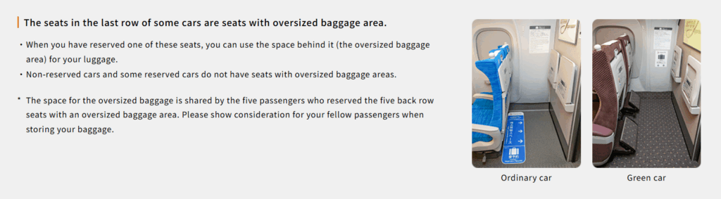 Seats with oversized baggage space must be booked at the same time you purchase your Shinkansen ticket.