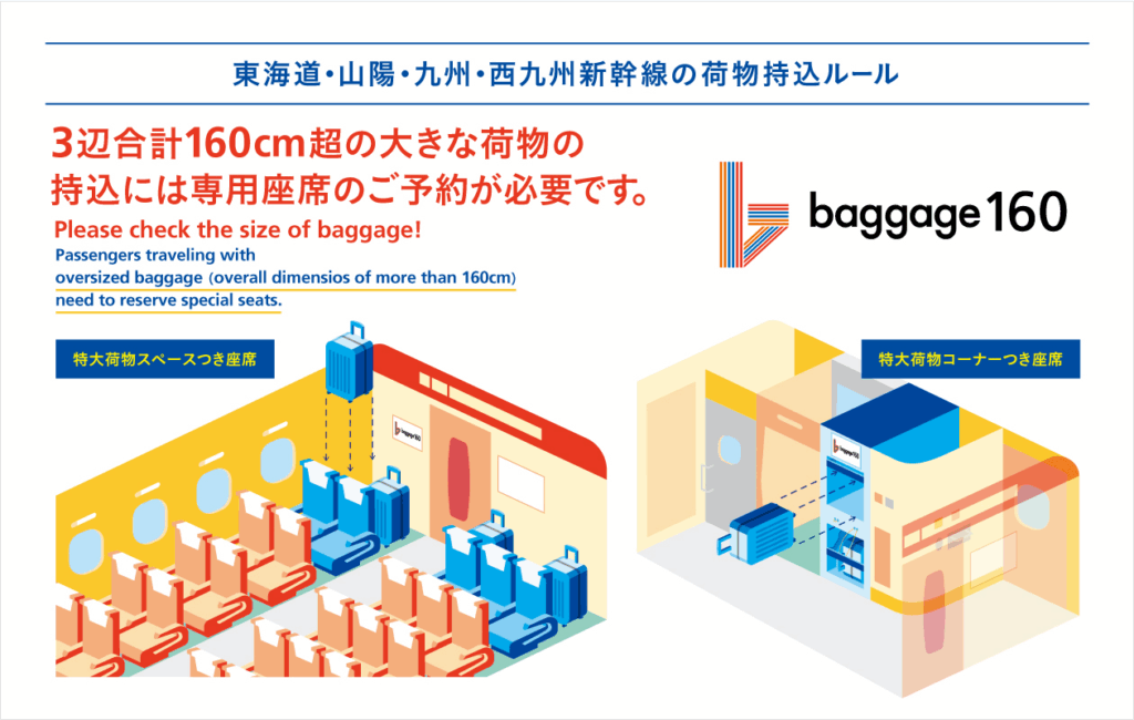 In addition, the Shinkansen has a rule for oversized luggage exceeding 160 cm in total dimensions (length + width + height). In such cases, you may be required to reserve a “seat with oversized baggage space,” which is the last-row seat of the car.