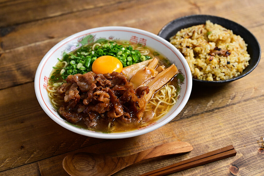 Tokushima Ramen features a rich pork-bone and soy sauce broth, topped with sweet-simmered pork belly and raw egg. It is commonly eaten together with rice — the Tokushima style.