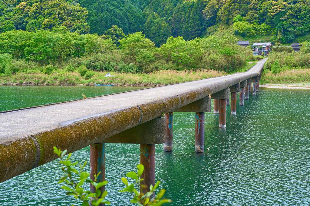 Cross unique chinkabashi (submersible bridges), designed without railings to withstand flooding.