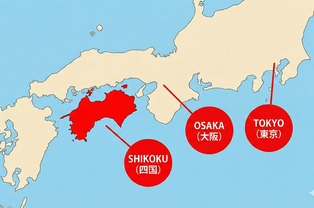 Shikoku lies southwest of Japan’s main island (Honshu), bordered by the calm Seto Inland Sea to the north and the vast Pacific Ocean to the south.