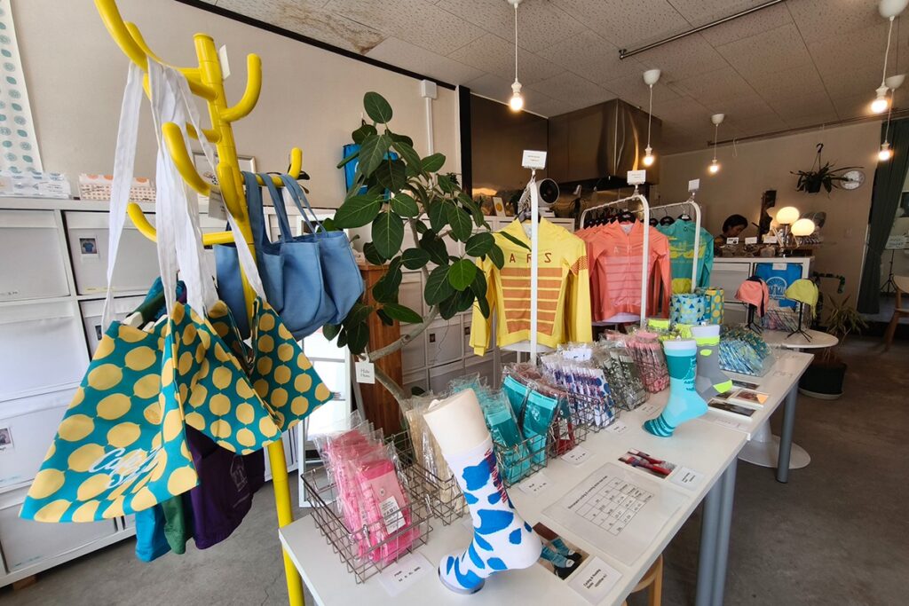 The interior is packed with original jerseys inspired by the Shimanami theme. In addition to jerseys, they offer a wide range of items, including cycling caps, gloves, socks, and musettes (sacoches). These items make for the perfect souvenir to remember your Shimanami Kaido trip or a great gift for your cycling friends.