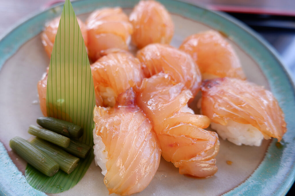 After a demanding ride, Izu Oshima’s local cuisine provides the perfect recovery.One must-try dish is Bekko Sushi, a regional specialty made by marinating white fish such as sea bream or tuna in a soy-based sauce infused with chili peppers. The result is a glossy, amber-colored topping with a balance of sweetness and subtle spice.