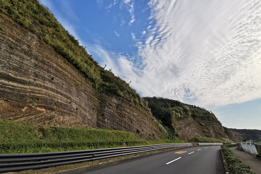 The main cycling route around Izu Oshima is the approximately 43 km Oshima Loop Road. With constant elevation changes, it’s a rewarding challenge for road cyclists.One of the highlights is the striking geological formation known as the “Baumkuchen.” This massive exposed cross-section of layered volcanic deposits—24 meters high and 600 meters long—reveals tens of thousands of years of eruptions from Mt. Mihara. Standing before it feels like witnessing a natural work of art shaped by time.