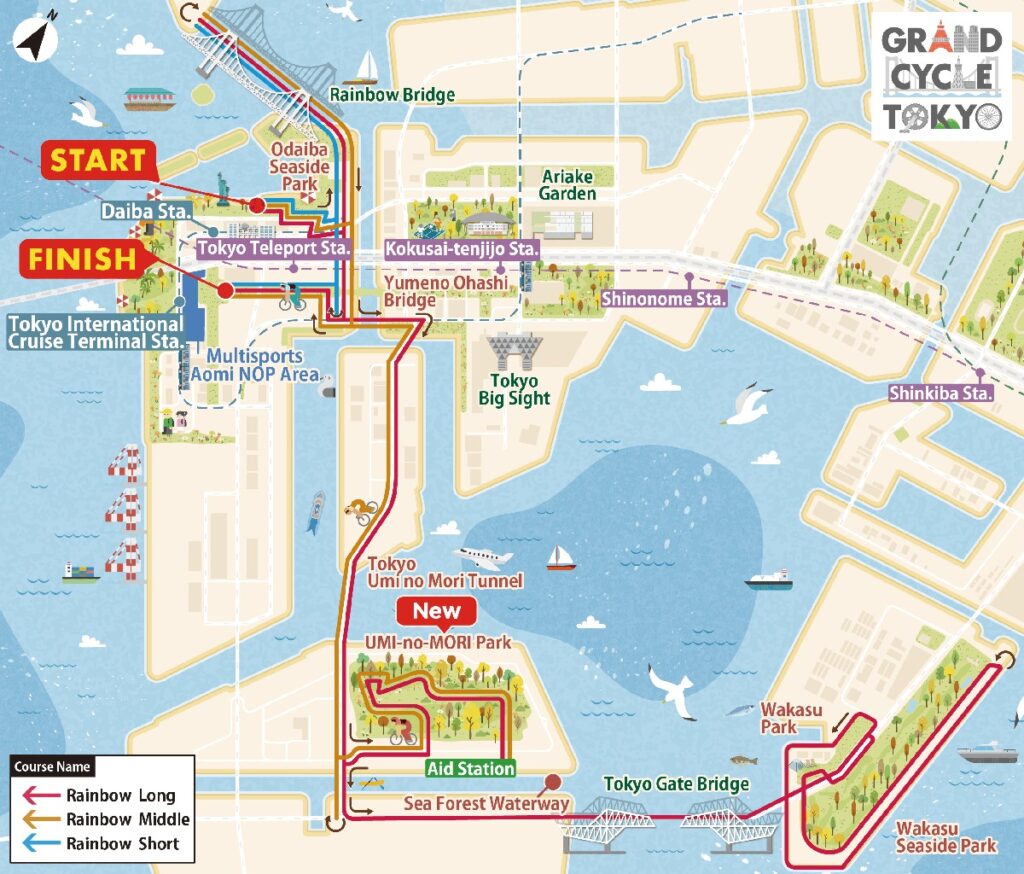 This route includes the Rainbow Bridge and takes riders through the scenic Tokyo Waterfront area, offering beautiful urban coastal views. - Short Course (Approx. 8 km)