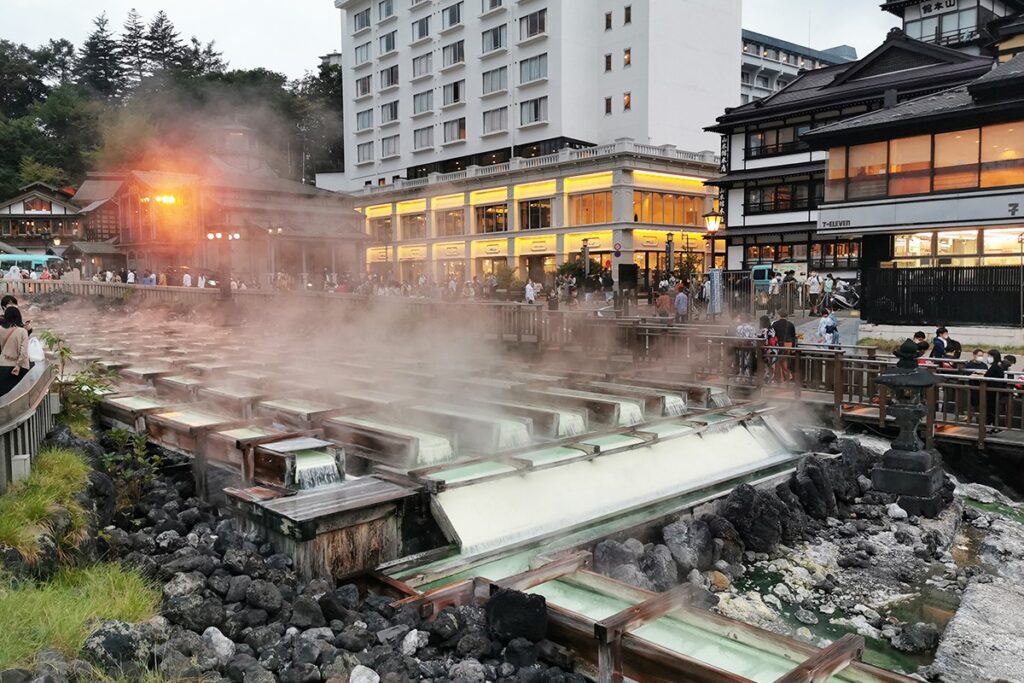 Kusatsu Onsen is one of Japan’s top hot springs and a dream destination for cyclists who love high-altitude rides. With the largest natural hot spring output in Japan, Kusatsu is part of Japan’s “Three Great Onsen.” Its sulfuric waters are highly acidic and famous for their healing power — locals say it can cure anything “except a broken heart.”At the center of town is the iconic Yubatake (“hot water field”), where steaming water gushes down wooden channels.